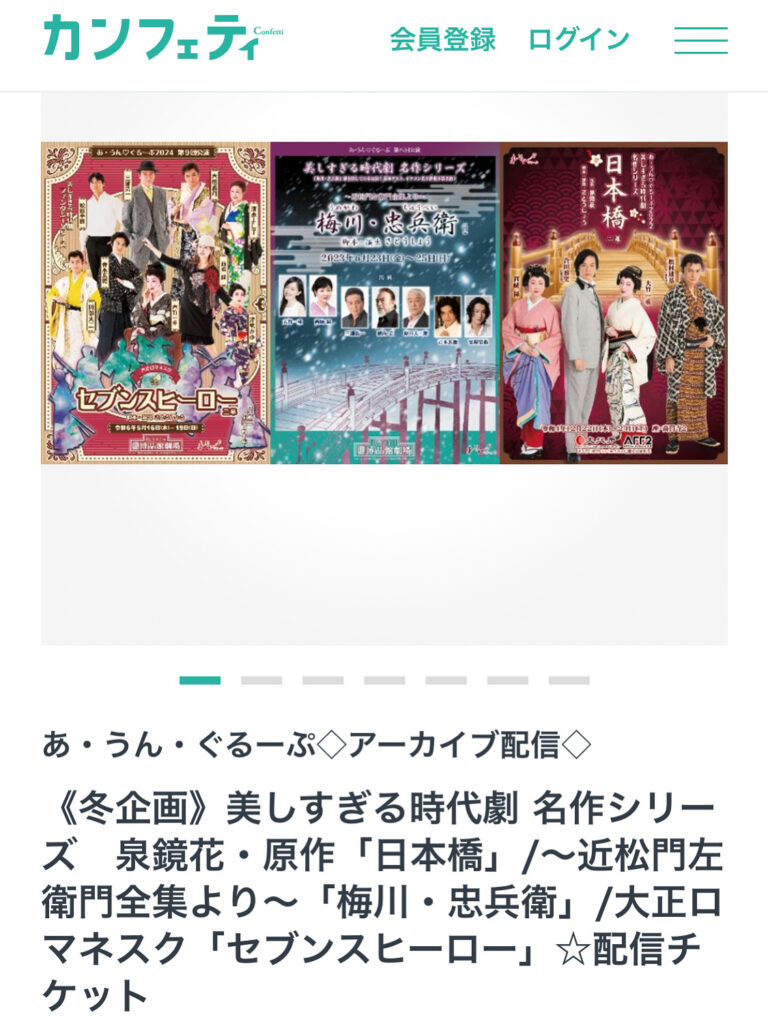 お知らせ カンフェティ冬企画 カンフェティの冬企画に参加しています!ぜひ、ご覧ください あ・うん・ぐるーぷ◇アーカイブ配信◇ 《冬企画》美しすぎる時代劇 名作シリーズ 泉鏡花・原作「日本橋」/〜近松門左衛門全集より〜「梅川・忠兵衛」/大正ロマネスク「セブンスヒーロー」 2025年12月27日 (土) 〜 2026年1月12日 (月・祝) [視聴UR... 2026年1月1日 aun